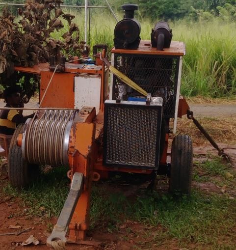 The machine, known as the Tensioner, is equipped with a diesel engine that powers the hydraulic system. It is specifically designed for running the hydraulic system. There is an automatic winding system in that machine for pilot rope winding on the reel.
